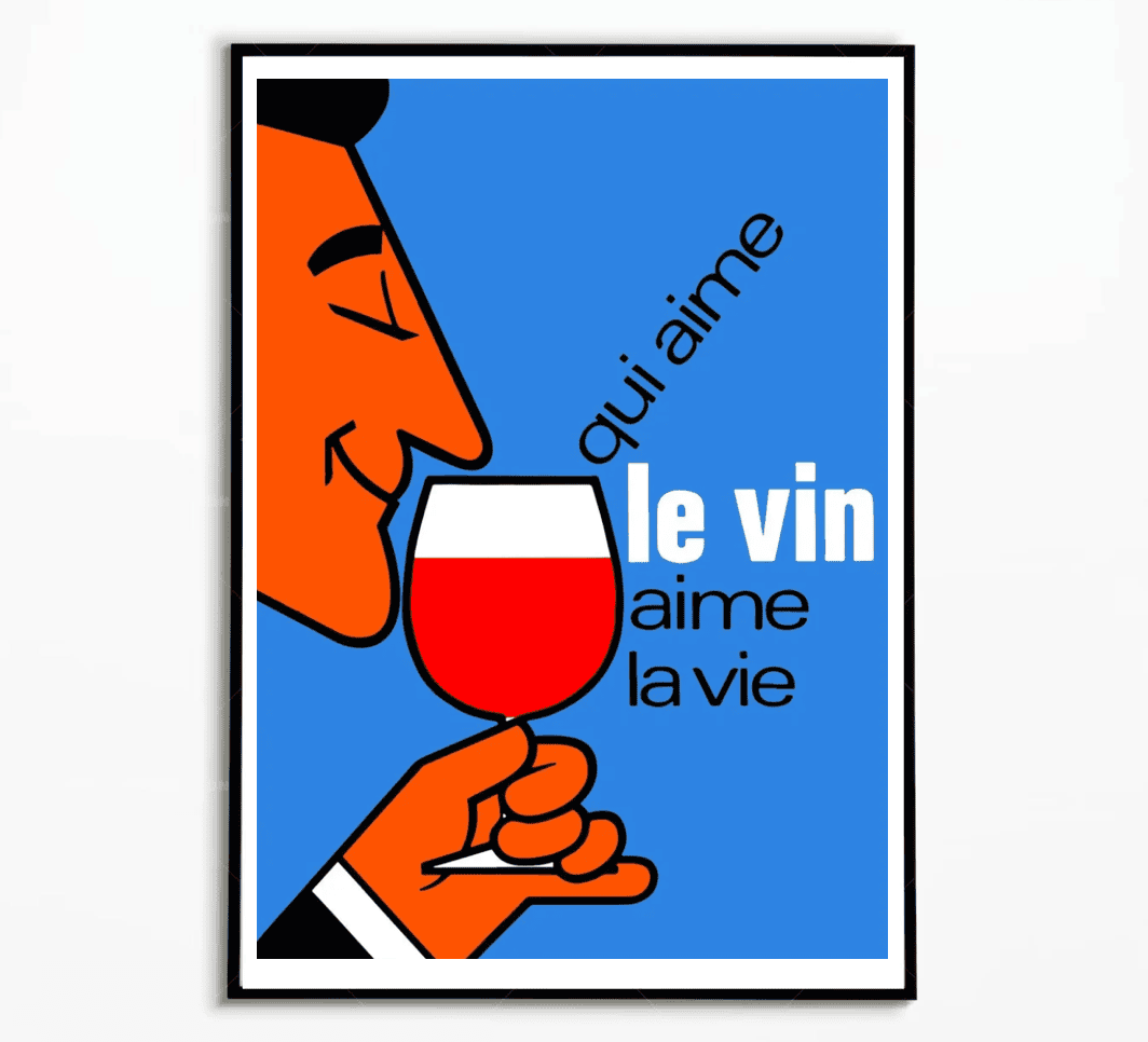 Reproduction d’une affiche vintage consacrée aux vins et spiritueux : qui Aime le Vin Aime la Vie. Un poster authentique pour les amateurs de décoration rétro et œnophiles.